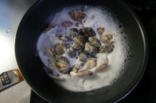 1.砂だししたアサリを、フライパンに水半カップくらい入れて火にかける。口が開いたら実を取り出す。アサリのエキスが出ている水分も取っておく。
