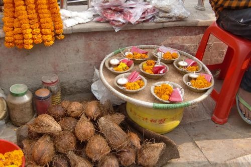 お供えに欠かせない灯明とマリーゴールド、ココナッツ