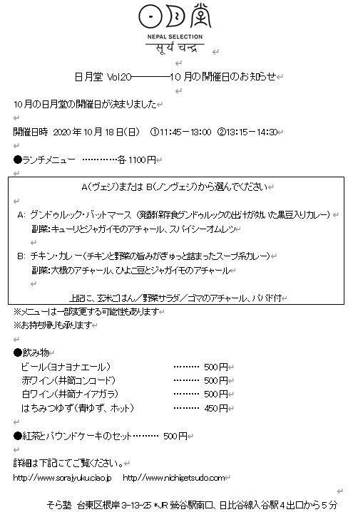 10月18日(日)の日月堂ネパール食堂のメニューが決まりました。